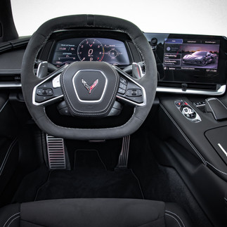 Die Sportwagen Ikone Corvette ist ein komplett neues Fahrzeug. Der grösste Unterschied ist die Lage des Motors: Analog zu Ferrari, McLaren oder Lamborghini und Co. ist der bullige V8 nicht mehr im Bug montiert, sondern mittig im Rahmen aus Aluminium und Karbon. Das klingt nach einer sehr interessanten Modifikation für das Fahrzeug. Durch die Verlagerung des Schwerpunkts und die bessere Balance wird das Fahrverhalten perfektioniert und die Lenkung entlastet. Auch die Traktion der 305er Walzen im Heck wird gesteigert. Diese Veränderung ist fantastisch und optimiert das Fahrerlebnis ideal.
